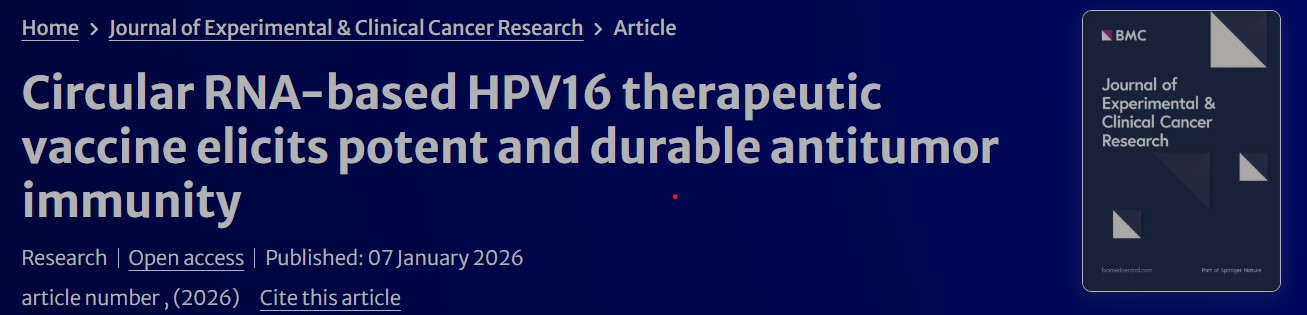 圓因生物自主研發(fā)的HPV相關(guān)腫瘤治療性疫苗TI-0093已于去年正式開啟在HPV16 陽性晚期復(fù)發(fā)或轉(zhuǎn)移性實(shí)體瘤患者的中臨床一期研究。作為全球首個(gè)進(jìn)入腫瘤治療領(lǐng)域臨床階段的環(huán)狀RNA藥物,其早期研發(fā)核心成果以《Circular RNA-based HPV16 therapeutic vaccine elicits potent and durable antitumor immunity》為題,于2026年1月7日發(fā)表于國際知名期刊《Journal of Experimental & Clinical Cancer Research》(《實(shí)驗(yàn)與臨床癌癥研究雜志》,簡稱J Exp Clin Cancer Res)。