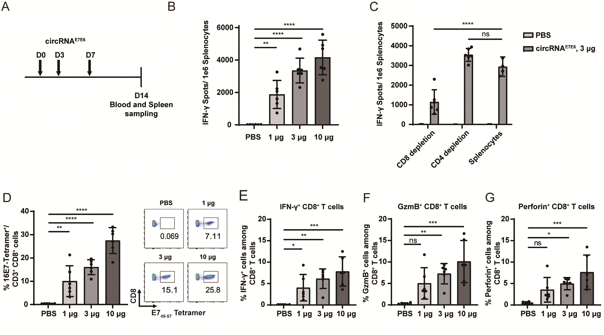 該研究依托圓因生物自主研發(fā)的環(huán)狀RNA技術(shù)平臺(tái),采用創(chuàng)新設(shè)計(jì)策略構(gòu)建編碼突變及免疫增強(qiáng)修飾型HPV16 E7/E6融合抗原的circRNAE7E6通過脂質(zhì)納米顆粒(LNP)遞送系統(tǒng)經(jīng)肌肉注射給藥。臨床前研究結(jié)果顯示,在C57BL/6小鼠模型中,circRNAE7E6可劑量依賴性誘導(dǎo)脾細(xì)胞產(chǎn)生抗原特異性IFNγ,顯著提升外周血中HPV16 E7特異性CD8? T細(xì)胞占比,并增強(qiáng)抗原特異性細(xì)胞毒性T淋巴細(xì)胞(CTL)中IFN-γ、穿孔素(PRF1)及顆粒酶B(GzmB)等關(guān)鍵效應(yīng)分子的表達(dá)。上述數(shù)據(jù)證實(shí),circRNAE7E6可在小鼠體內(nèi)高效誘發(fā)針對(duì)HPV的特異性細(xì)胞免疫應(yīng)答。